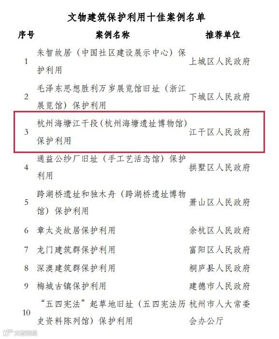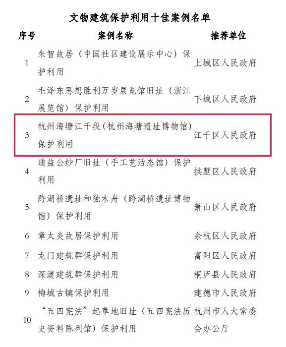 2020年4月至10月,杭州市园林文物局开展了“十佳文物保护利用案例”征集评选活动。江干区积极行动,组织发动辖区文物保护单位、民办博物馆参与活动。最终,“杭州海塘江干段”(杭州海塘遗址博物馆)保护利用案例在137个案例中脱颖而出,成功入选“文物建筑保护利用十佳案例”。