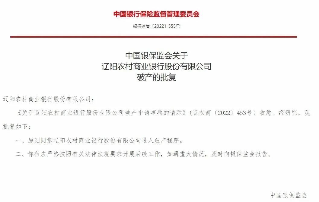 8月26日,银保监会官网披露《中国银保监会关于辽阳农村商业银行股份有限公司破产的批复》:经研究,原则同意辽阳农村商业银行股份有限公司进入破产程序。你行应严格按照有关法律法规要求开展后续工作,如遇重大情况,及时向银保监会报告。