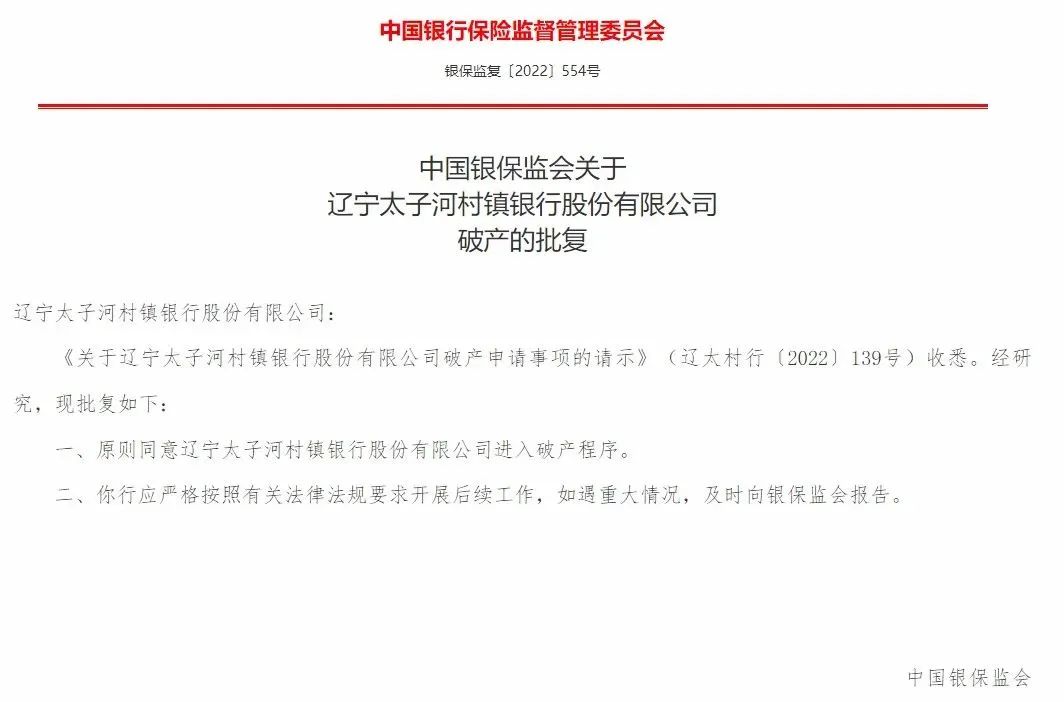 同日,银保监会官网披露《中国银保监会关于辽宁太子河村镇银行股份有限公司破产的批复》:原则同意辽宁太子河村镇银行股份有限公司进入破产程序。你行应严格按照有关法律法规要求开展后续工作,如遇重大情况,及时向银保监会报告。