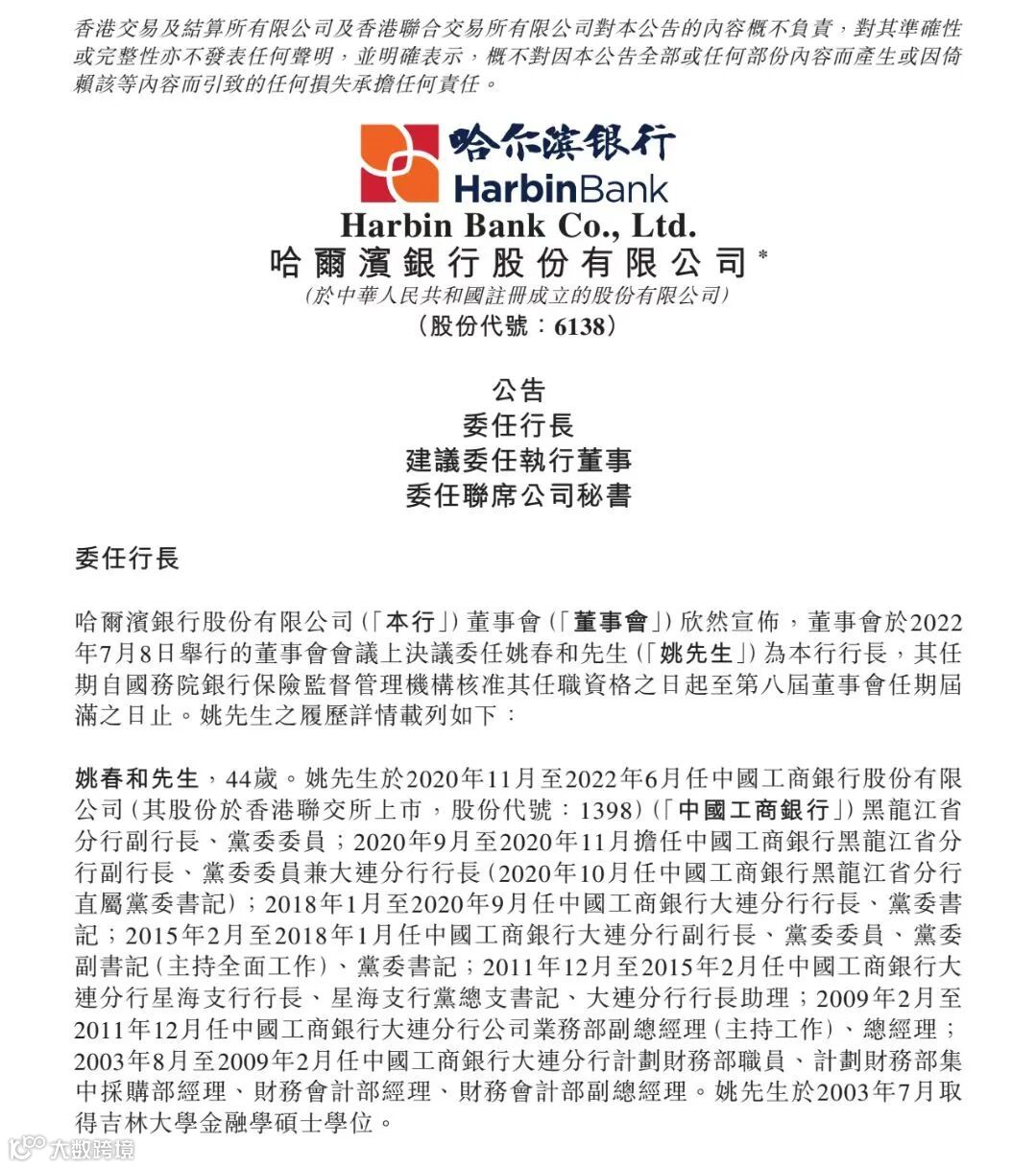公告显示,姚春和,44岁,吉林大学金融学硕士学位,2020年11月至2022年6月任中国工商银行黑龙江省分行副行长、党委委员。此前,历任中国工商银行大连分行财务会计部副总经理、公司业务部总经理,大连分行星海支行行长、星海支行党总支书记、大连分行行长助理,大连分行副行长、党委委员、党委副书记(主持全面工作),大连分行行长、党委书记。