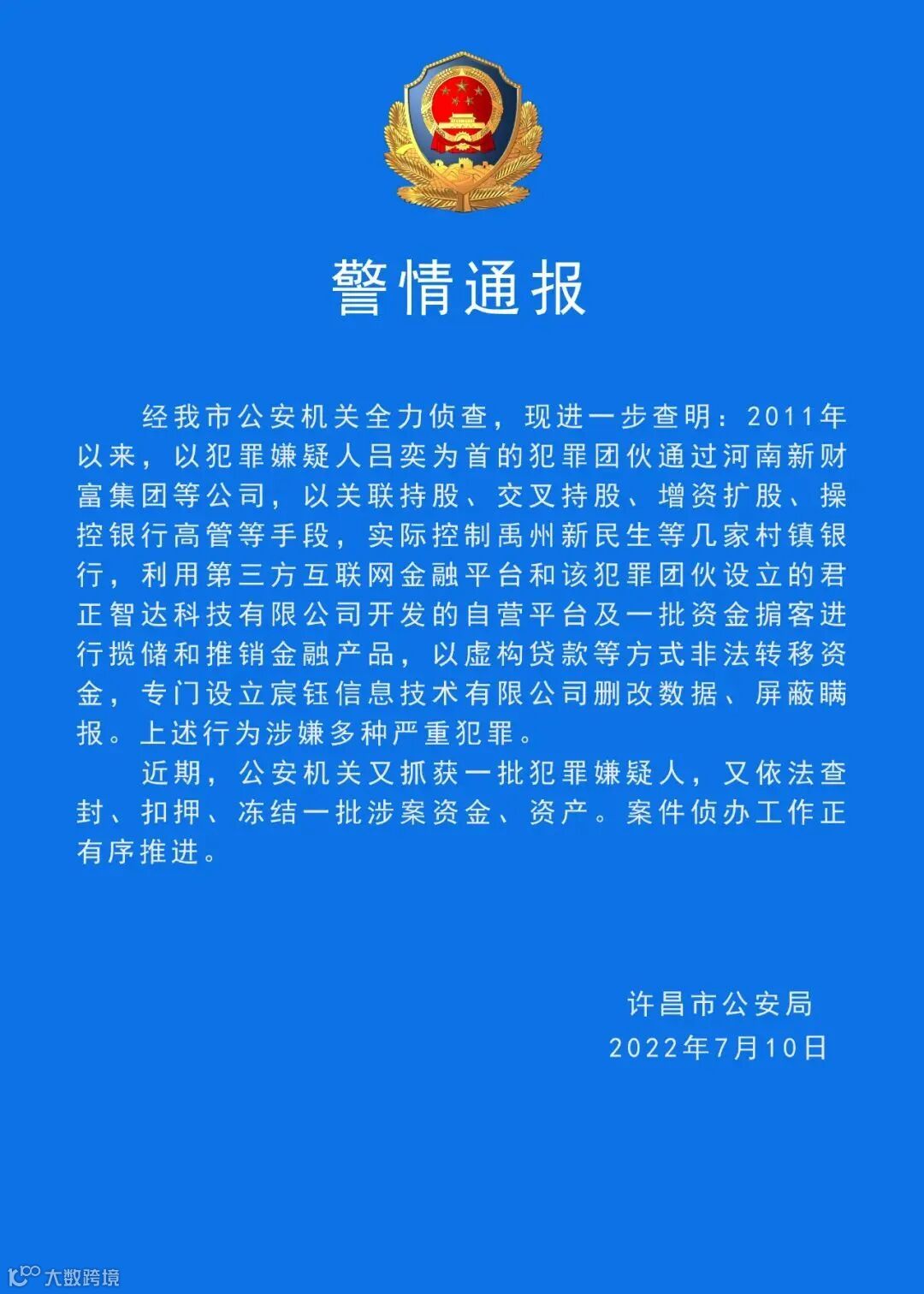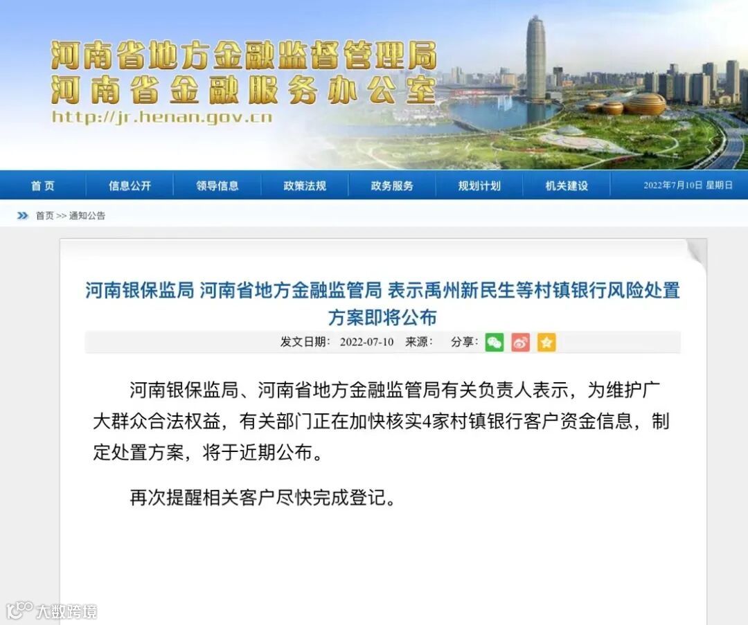 河南省地方金融监管局网站10日晚发布公告:河南银保监局、河南省地方金融监管局有关负责人表示,为维护广大群众合法权益,有关部门正在加快核实4家村镇银行客户资金信息,制定处置方案,将于近期公布。