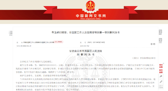 随着一纸判决的公布,这一谜团也水落石出:因涉嫌行贿罪、非国家工作人员受贿罪,李玉峰于2021年1月被兰州市西固区监察委员会采取留置措施,当年7月被刑事拘留及执行逮捕。最终,李玉峰一审被判有期徒刑六年六个月,并处罚金20万元。