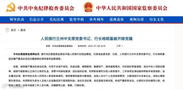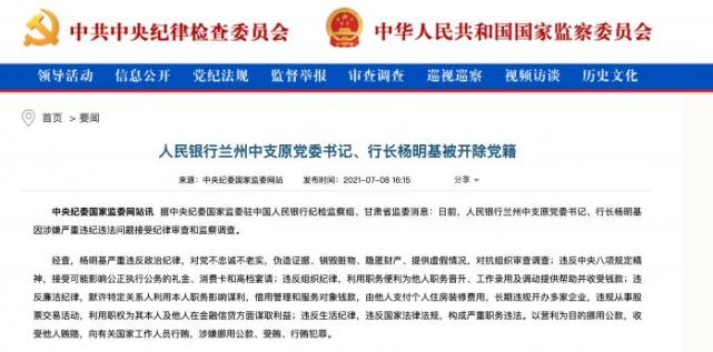 然而,退休并不意味着平安下马。2020年12月21日,据中央纪委国家监委驻中国人民银行纪检监察组、甘肃省纪委监委消息:中国人民银行兰州中心支行原党委书记、行长杨明基涉嫌严重违纪违法,接受甘肃省纪委监委纪律审查和监察调查。