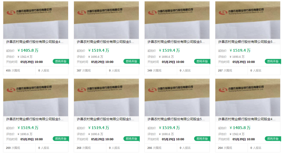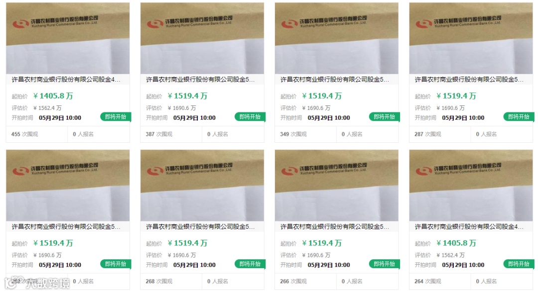上述8条拍卖信息目前已出现在互联网拍卖平台,拍卖的许昌农商行股金共计4200万股,评估价合计 1.3亿余元,起拍价合计约1.19亿元。拍卖时间为5月29日至30日。