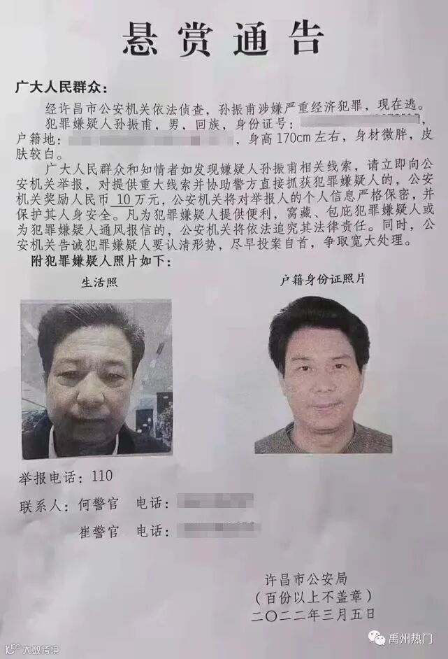 3月5日许昌市公安局发布的《悬赏通告》显示,“经许昌市公安机关依法侦查,孙振甫涉嫌严重经济犯罪,现在逃。”通告称,对提供重大线索并协助警方抓获犯罪嫌疑人的,公安机关奖励人民币10万元。