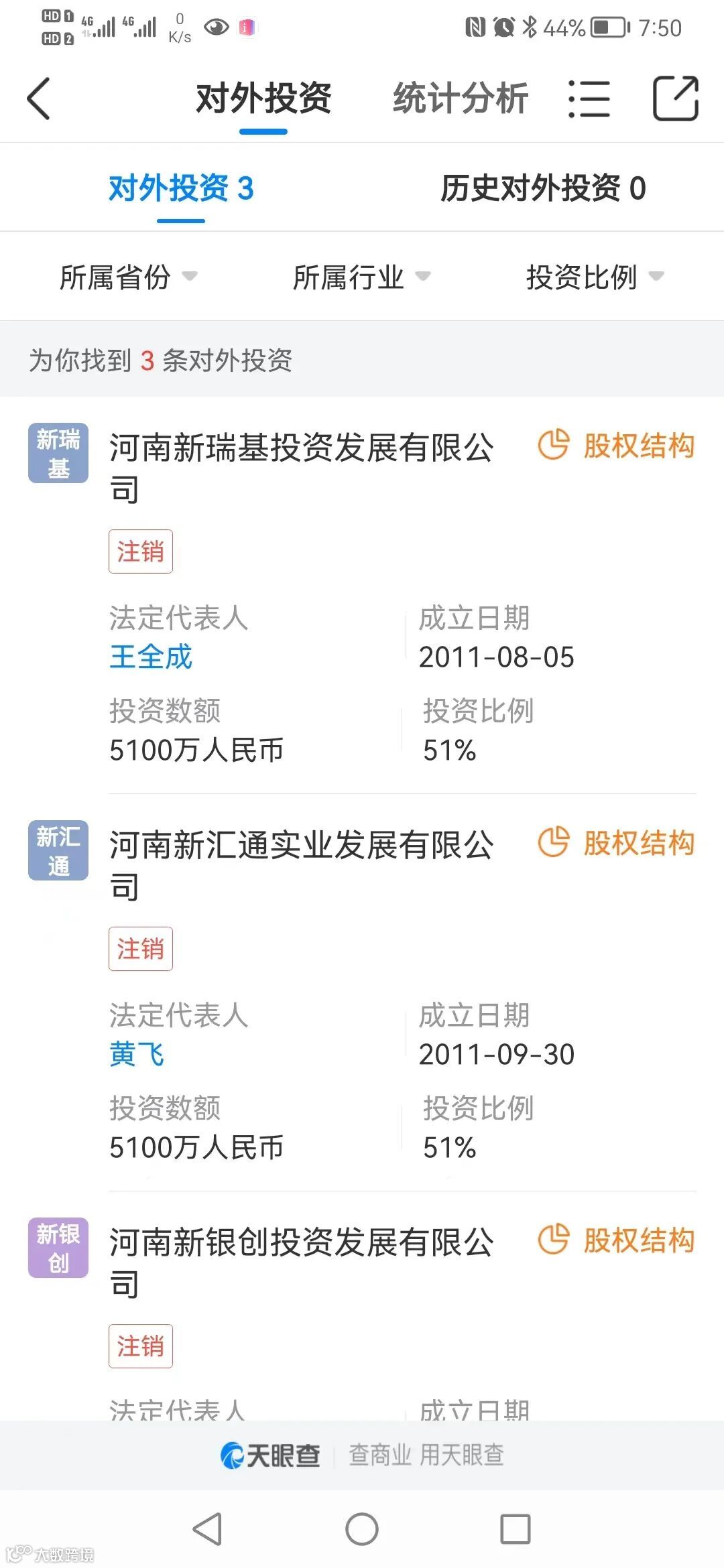 在对外投资方面,河南新财富集团是三家企业的大股东,持股均为51%。这三家企业是:河南新瑞基投资发展公司、河南新汇通实业发展公司、河南新银创投资发展公司。