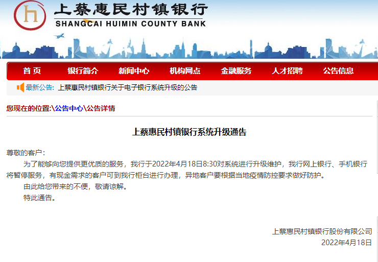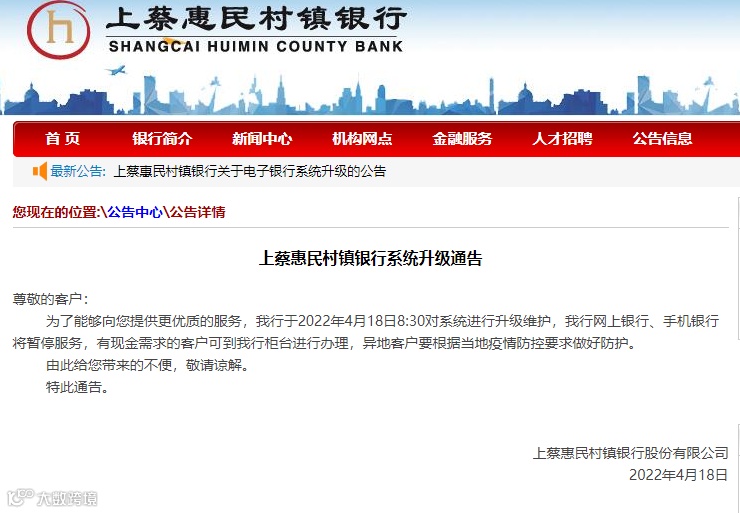 4月18日和19日,这六家村镇银行分别通过网站、微信公号、APP等途径发布“系统升级通告”,称因系统进行升级维护,其网上银行、手机银行暂停服务。