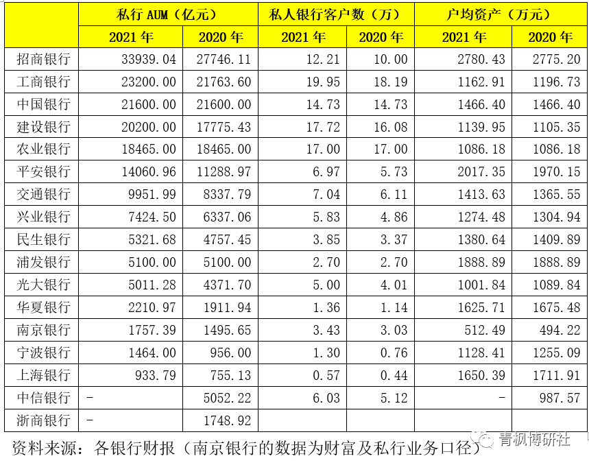 (1)宁波银行与上海银行披露了其2021年底的私人银行管理资产规模分别为1464亿元和934亿元,是城商行中私行业务规模最大的两家银行。