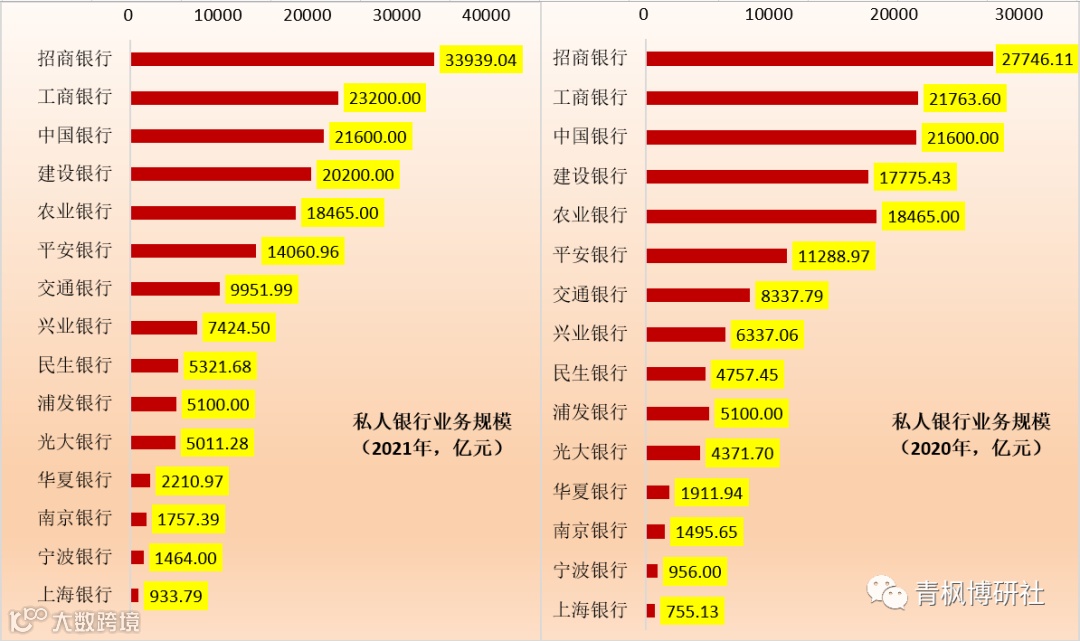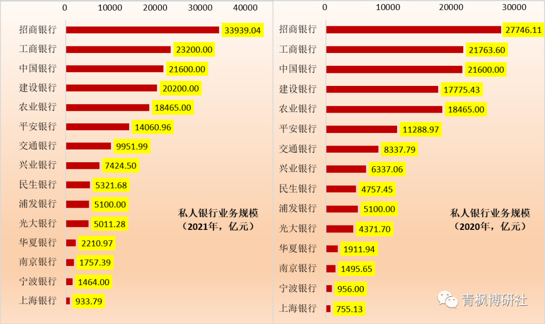 除以上11家银行外,剩余银行的私行业务规模均低于5000亿元。