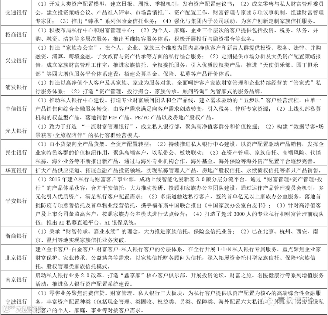 (1)管理私人银行资产规模超过2万亿的银行增至4家,从高到低依次为招行(3.39万亿)、工行(2.32万亿)、中行(2.16万亿)和建行(2.02万亿),这四家银行的私行业务规模合计接近10万亿。
