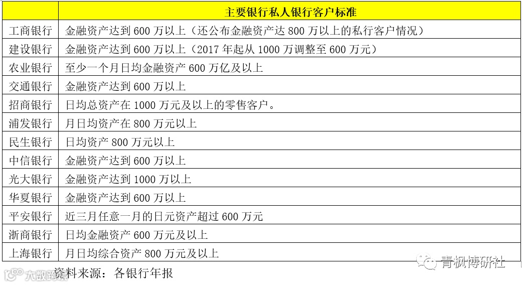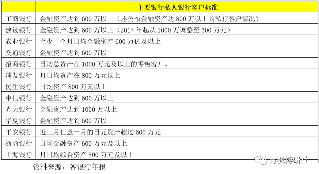 (1)工行、农行、交行、平安银行、中信银行以及浙商银行的私人银行客户标准是日均金融资产在600万元(含)以上。