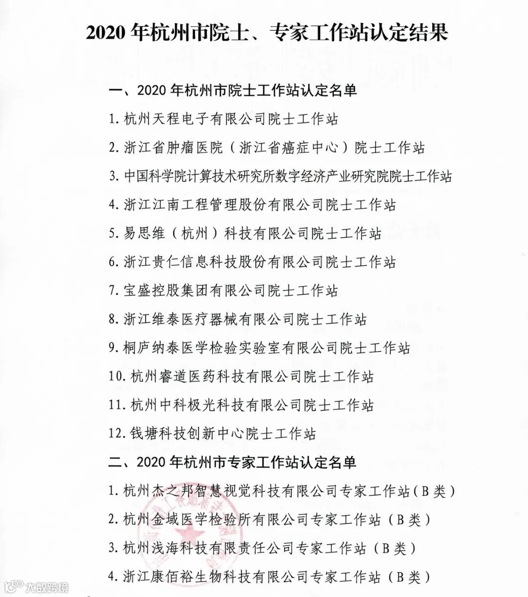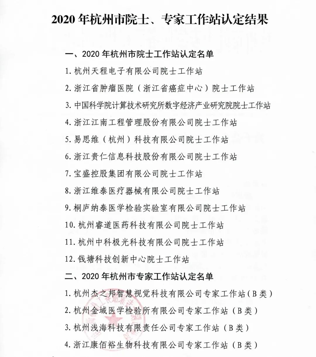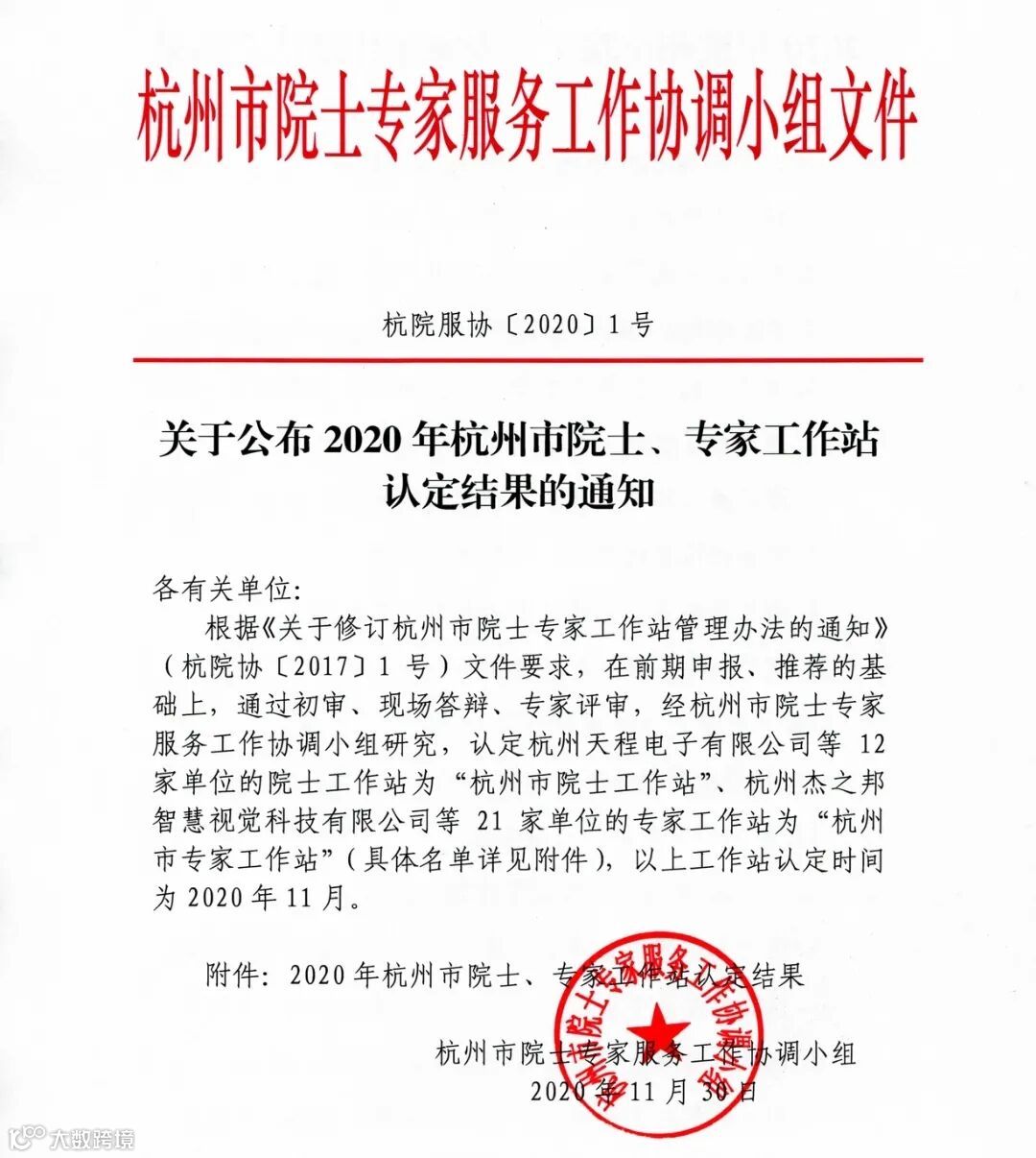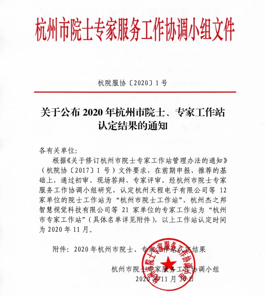 近日,2020年杭州市院士、专家工作站认定结果公布。钱塘智慧城辖区的杭州天程电子有限公司院士工作站入选市级院士工作站名单、杭州杰之邦智慧视觉科技有限公司专家工作站(B类)入选市级专家工作站名单。