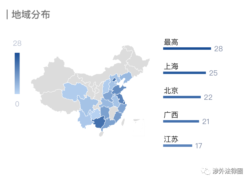 以“独立保函欺诈”设置为检索条件,截止2022年5月31日,在独立保函欺诈项下法院裁判文书的数量有220篇[5],同时北京、上海以及广西的文书数量在全国地域分布中位列前茅。