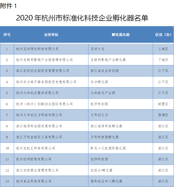 根据《杭州市科技企业孵化器认定和管理办法》(杭科高〔2020〕74号)的有关规定,经过公开征集、各区县(市)科技局审核推荐、专家现场走访和评审、公示以及行政决策等程序,认定38家孵化器为2020年杭州市标准化科技企业孵化器。江干区共有三家孵化器入围,其中钱塘智慧城的东方孵化园以及九知拾光产业园两家企业上榜。