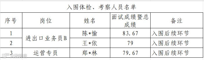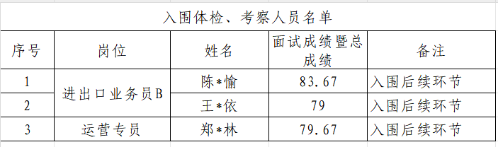 根据浙江海投云贸国际供应链有限公司2024年度公开招聘工作人员的公告》(2024.12.31)有关要求,经考生报名、资格审查、面试等环节,现将考生面试成绩(总成绩)以及入围后续体检、考察环节的人员名单公布如下: