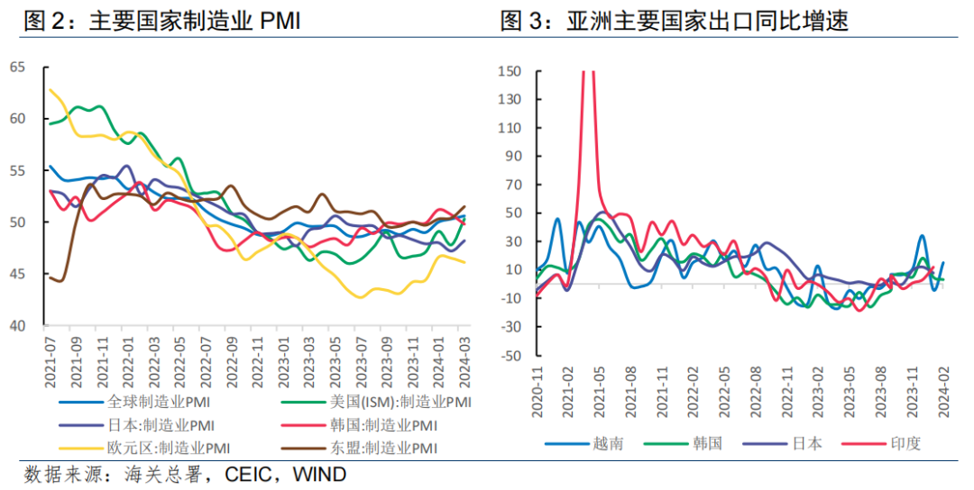 主要经济体中,美国ISM制造业PMI首登荣枯线,东盟连续3月位于荣枯线上方,欧元区、日本、韩国表现较差,仍处于低景气度区间。从亚洲主要商品出口国情况来看,3月份越南、韩国出口增速分别达到15%、3.1%,2月份日本、印度出口分别增长7.8%、11.9%,反映全球贸易形势明显好转。