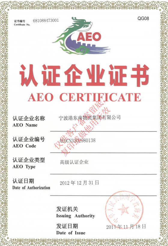 1.报关行名称:宁波港东南物流集团有限公司是海关高级认证企业,并提供商品归类咨询。