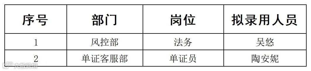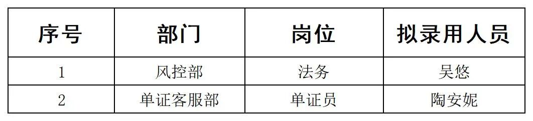 根据《浙江海投云贸国际供应链有限公司2024年度公开招聘7名工作人员的公告》(2024.2.27)有关要求,经考生报名、资格审查、面试、体检和考察环节,经研究,确定以下2名人员为第一部分拟录用对象,现公示如下: