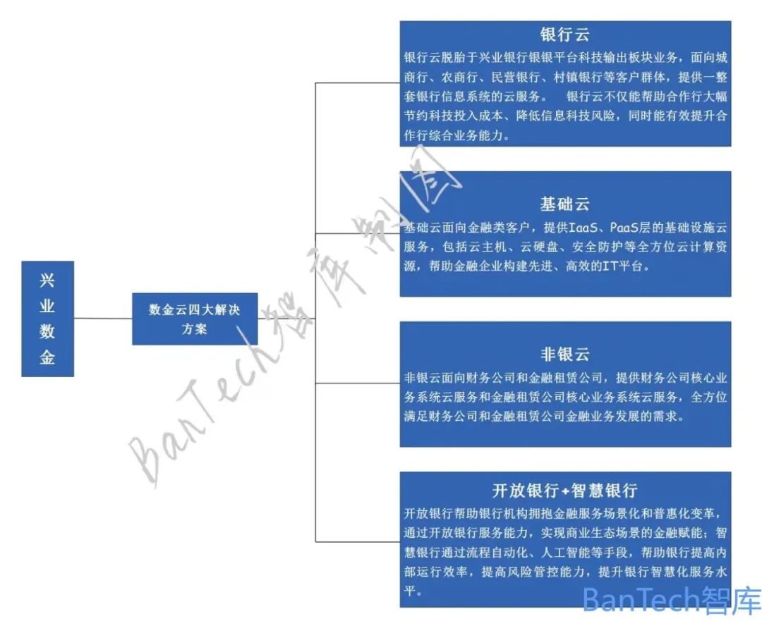 数金云,包含四大解决方案——银行云解决方案、基础云解决方案、非银云解决方案、开放银行+智慧银行解决方案。数金云目前包括四大服务——银行服务、非银服务、政企服务及容灾服务。