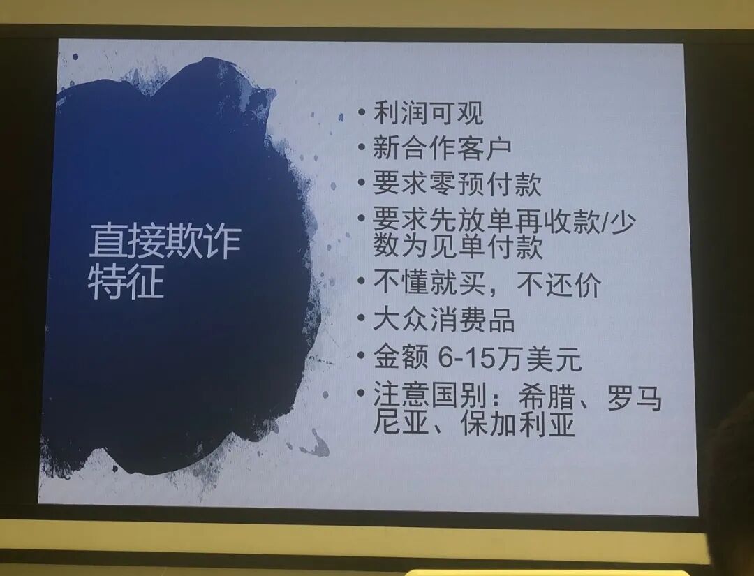 在风险提示方面,讲师潘源提醒各业务部门注意,目前市场上发生的诈骗案件较多,要格外注意外商诈骗现象,特别对上下游都是中间商介绍的业务,要仔细审查其贸易的真实性,不能盲目开展业务。