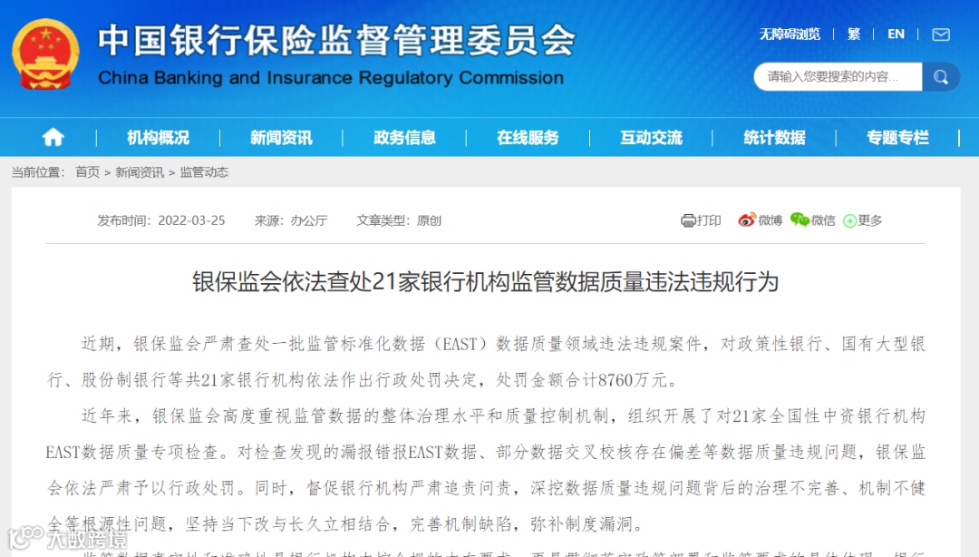 3月25日,银保监会网站显示,近期银保监会严肃查处一批监管标准化数据(EAST)数据质量领域违法违规案件,对政策性银行、国有大型银行、股份制银行等共21家银行机构依法作出行政处罚决定,处罚金额合计8760万元。