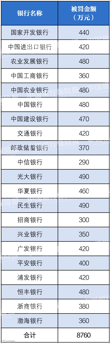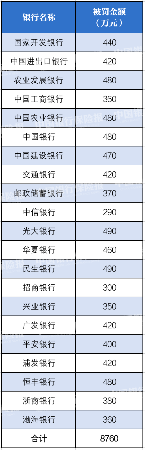 今日的罚单显示,国家开发银行被罚440万元、进出口银行被罚420万元、农业发展银行被罚480万元、工商银行被罚360万元、农业银行被罚480万元、中国银行被罚480万元、建设银行被罚470万元、交通银行被罚420万元、邮储银行被罚370万元、中信银行被罚290万元、光大银行被罚490万元、华夏银行被罚460万元、民生银行被罚490万元、招商银行被罚300万元、兴业银行被罚350万元、广发银行被罚420万元、平安银行被罚400万元、浦发银行被罚420万元、恒丰银行被罚480万元、浙商银行被罚380万元、渤海银行被罚360万元。