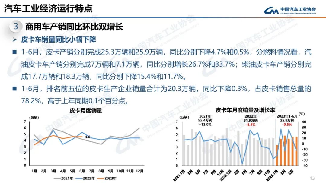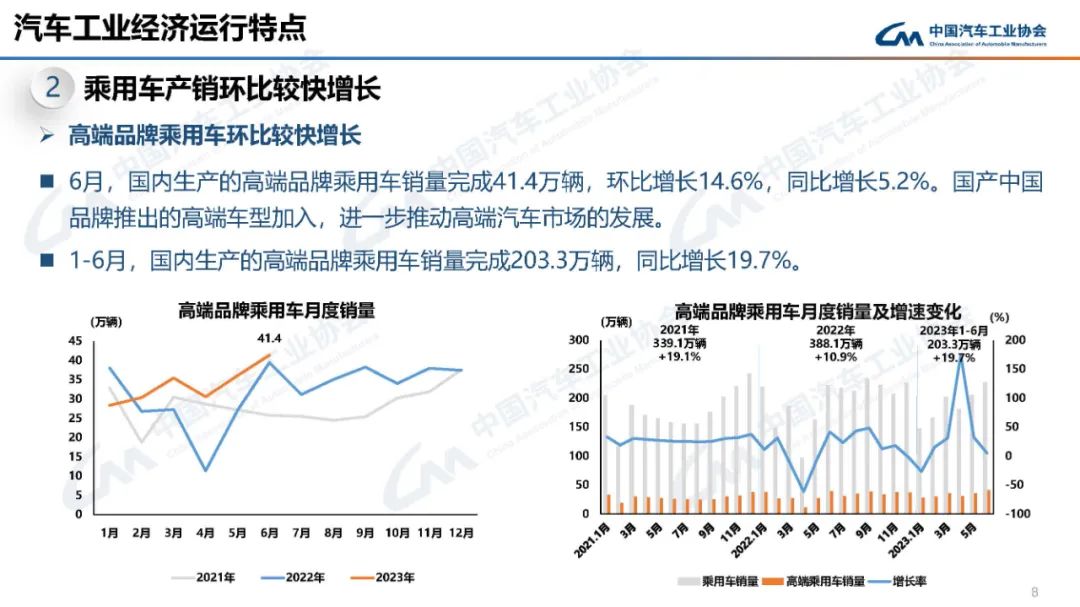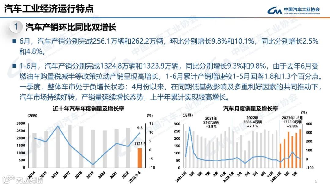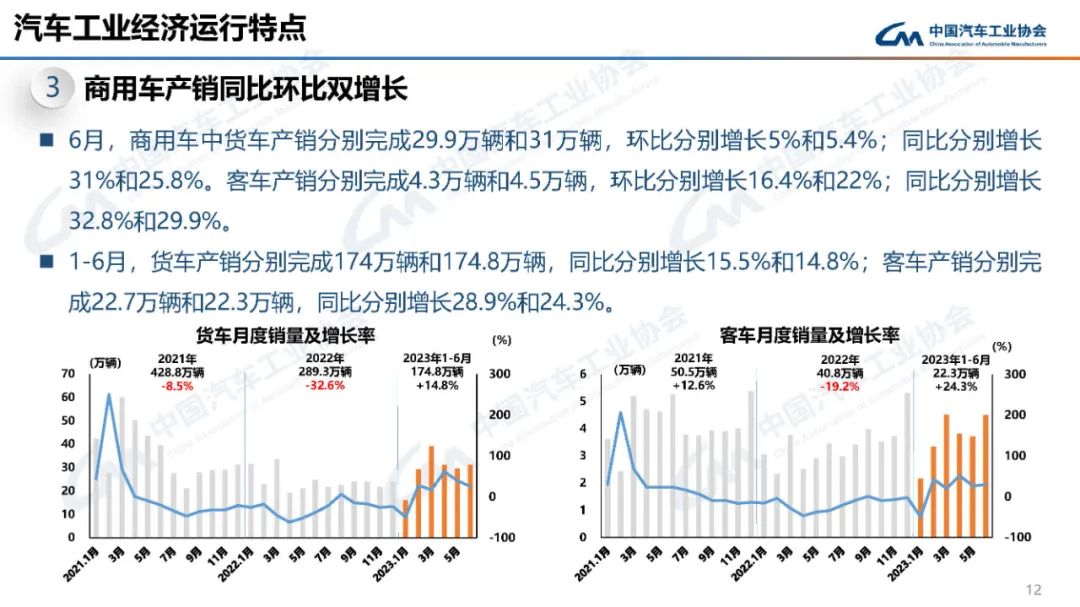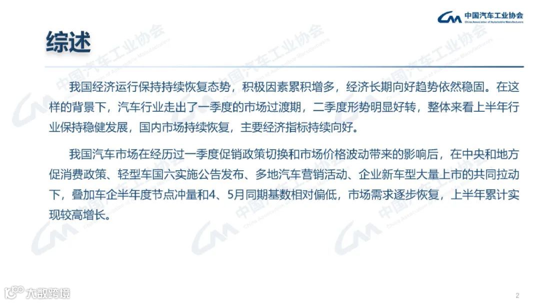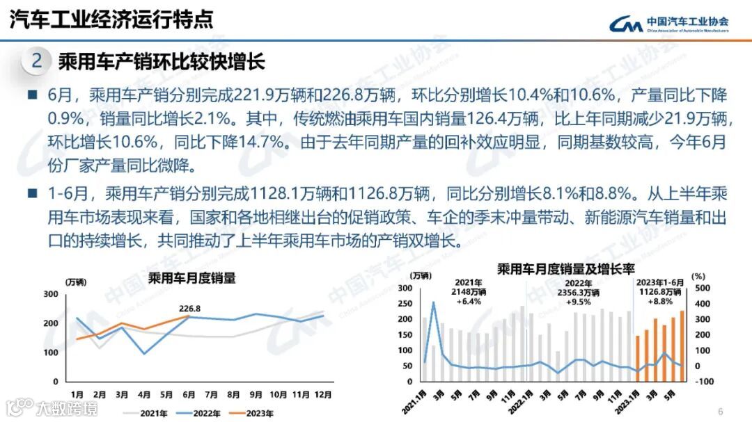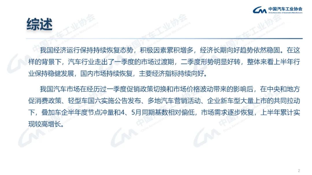 我国汽车市场在经历过一季度促销政策切换和市场价格波动带来的影响后,在中央和地方促消费政策、轻型车国六实施公告发布、多地汽车营销活动、企业新车型大量上市的共同拉动下,叠加车企半年度节点冲量和4、5月同期基数相对偏低,市场需求逐步恢复,上半年累计实现较高增长。