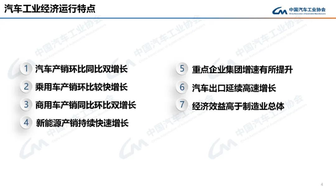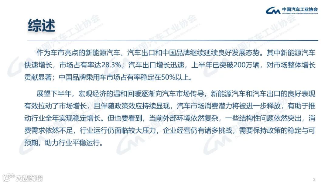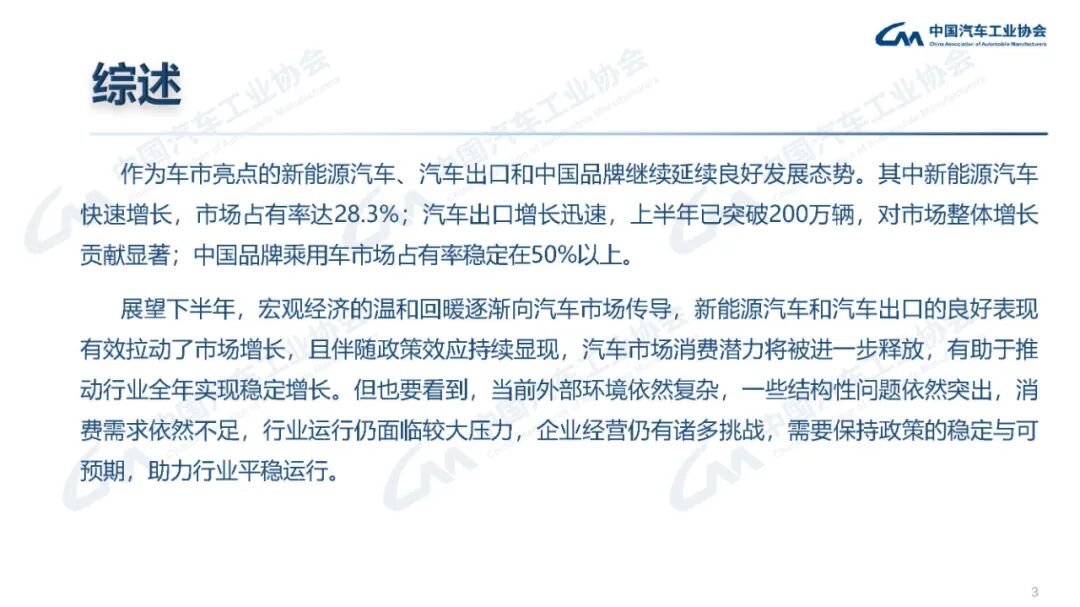 展望下半年,宏观经济的温和回暖逐渐向汽车市场传导,新能源汽车和汽车出口的良好表现有效拉动了市场增长,且伴随政策效应持续显现,汽车市场消费潜力将被进一步释放,有助于推动行业全年实现稳定增长。但也要看到,当前外部环境依然复杂,一些结构性问题依然突出,消费需求依然不足,行业运行仍面临较大压力,企业经营仍有诸多挑战,需要保持政策的稳定与可预期,助力行业平稳运行。