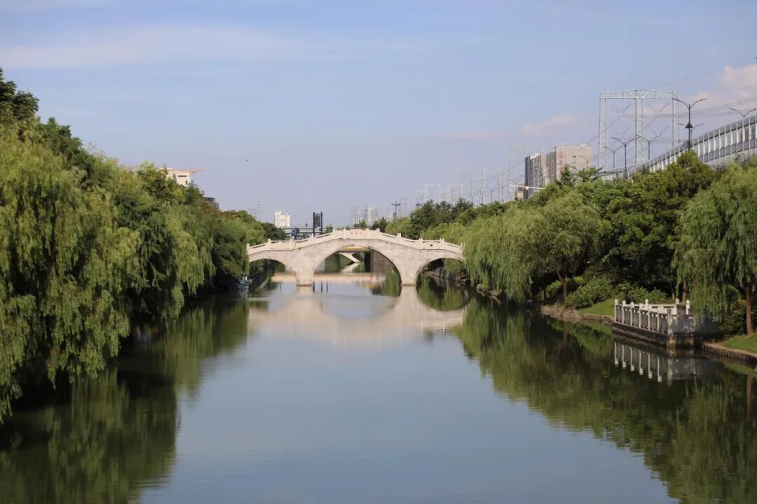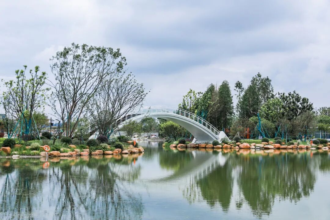 位于杭州九乔国际数字商贸城核心区域的丰收湖,地跨江干、余杭两区,公园设计精于形、胜于意,通过地面、水面、空中多维游线交织交错,体现“人在画中、画在人中”的诗画园林空间。