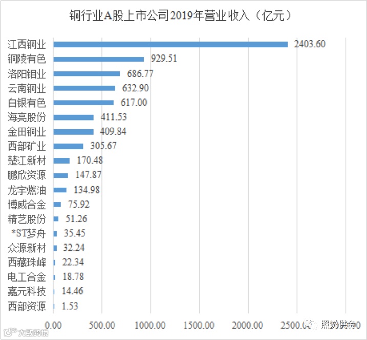 其中,以绝对优势占领铜行业龙头的江西铜业营业收入2403.6亿元,占19家公司总收入的三分之一,铜陵有色和洛阳钼业分别以929.51亿元和686.77亿元位列第二、三位。
