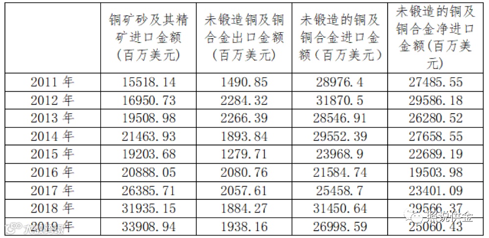 表2 2011-2019年铜矿砂及其精矿、未锻造铜及铜合金进出口情况统计