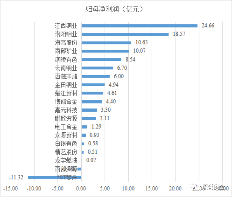 净利润方面,江西铜业归属母公司净利润为24.66亿元,位列铜行业19家上市公司净利润榜单第一。西部资源和*ST梦舟两家公司出现亏损,*ST梦舟亏损金额高达11.32亿元。