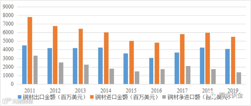 从进出口贸易情况来看,2011-2019年来,我国铜材一直呈现贸易逆差状态。2011年净进口额达到了3302.47百万美元,之后有所下降,出口额则较为稳定。2019年铜材出口金额4114.95百万美元,进口金额为5482.15百万美元,净进口额为1367.20百万美元。