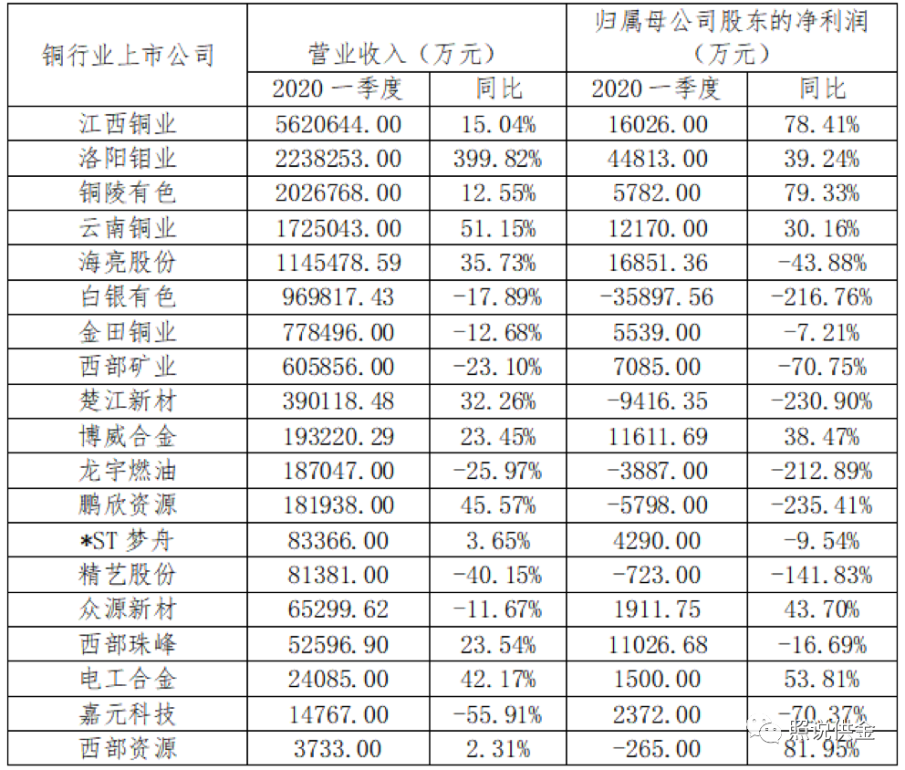 2020年初新冠疫情对铜行业企业的生产经营产生造成了一定影响,铜金属价格跌幅较大,近半铜行业上市公司一季度营业收入和净利润较上年同期有所下降。