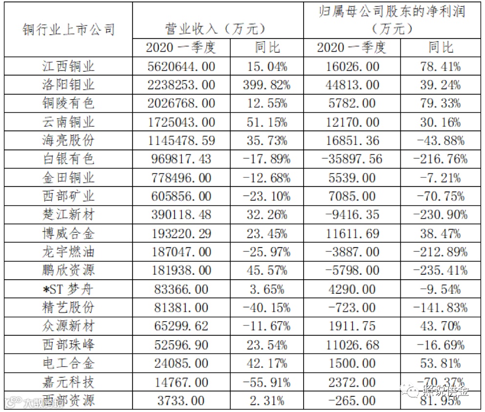 表3 2020年一季度铜行业19家A股上市公司营业收入及净利润