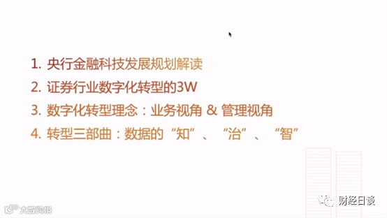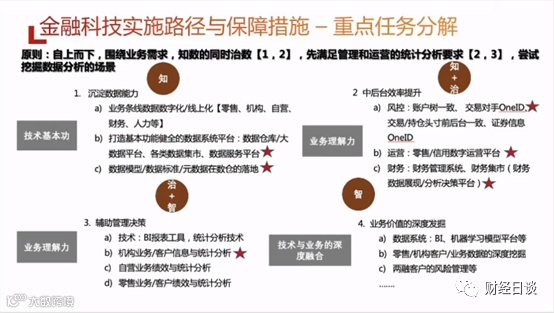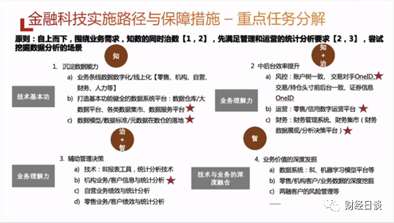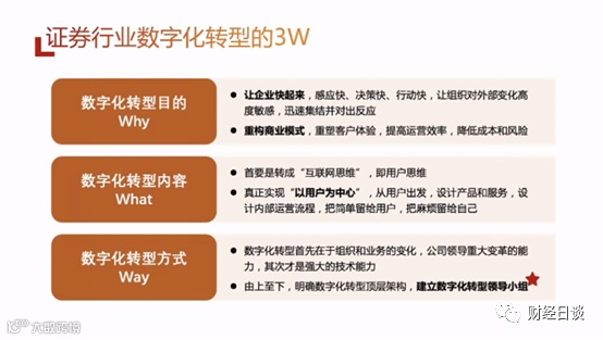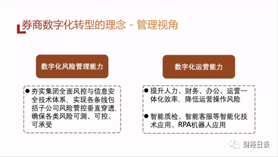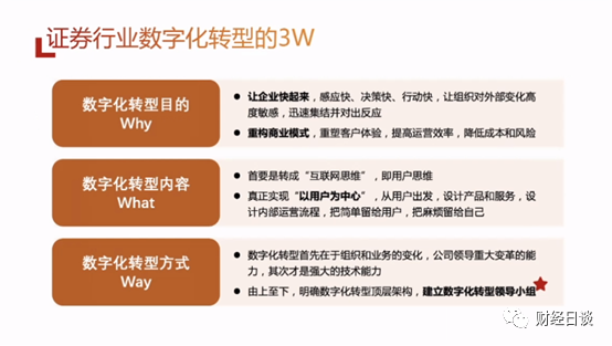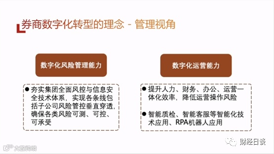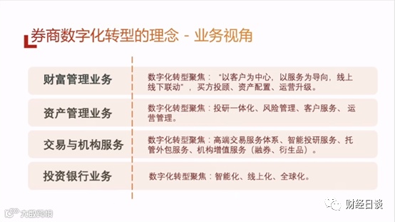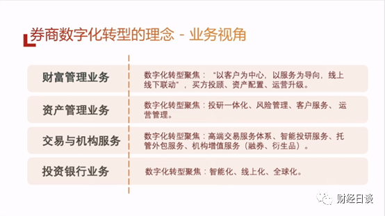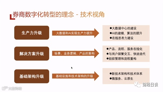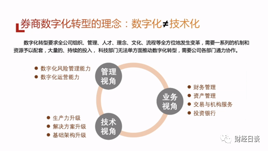 管理层面:要打造数字化风险管理能力、数字化运营能力;业务层面:涉及财务管理、资产管理、交易与机构服务、投资银行等;技术层面:包括生产力升级、解决方案升级、基础架构升级等。