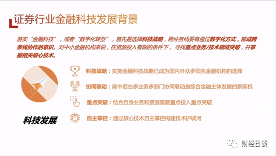 结合证券行业金融数字化转型实践,王勇认为,证券机构应该把数据作为底座、作为业务发展的驱动力,特别是中小机构,需要从科技战略、协调联动、重点突破、自主掌控四个关键要素出发,推进数字化转型。