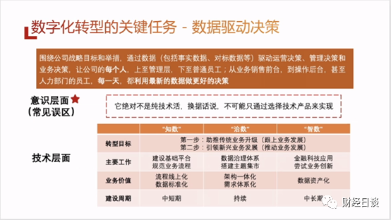 王勇认为,数字化是全方位管理流程的再造,其关键任务是要通过数据驱动运营决策、管理决策和业务决策,技术层面实现“知数”、“治数”、“智数”三步走。要自上而下,围绕业务需求,沉淀数据能力的同时提升中后台效率,满足管理和运营的统计分析要求,并尝试挖掘数据分析的价值。