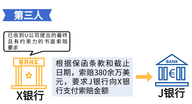 合同履行中,U公司认为光伏组件不符合《有限质保函》所担保的输出功率,并委托两家公司进行了检测,检测结果显示样本模块性能低于预期。于是,U公司通过邮件通知B公司如果不在限期内赔偿其产品质量损失,就将行使X银行保函下索赔的权利。限期后,X银行通知J银行,已收到U公司提出的最终且有约束力的书面索赔要求,根据保函条款和截止日期,索赔380余万美元,要求J银行向X银行支付索赔金额。