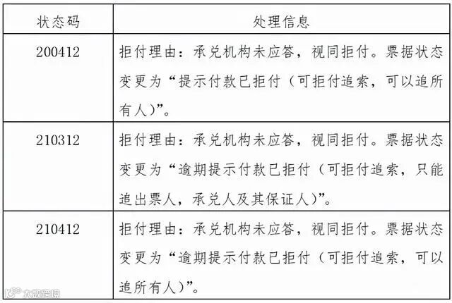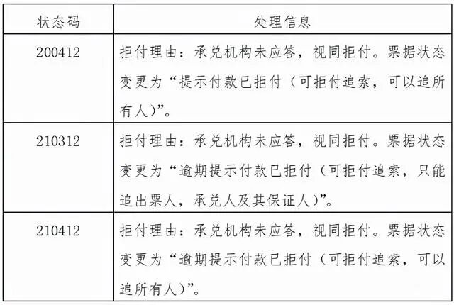 承兑人未在规定期限内应答,电子商业汇票系统于日终变更票据状态为拒付状态后,向承兑人接入机构和持票人接入机构发送“040票据状态变更通知”报文。“040票据状态变更通知”报文增加提示付款拒付的业务场景,相关状态码和处理信息如下: