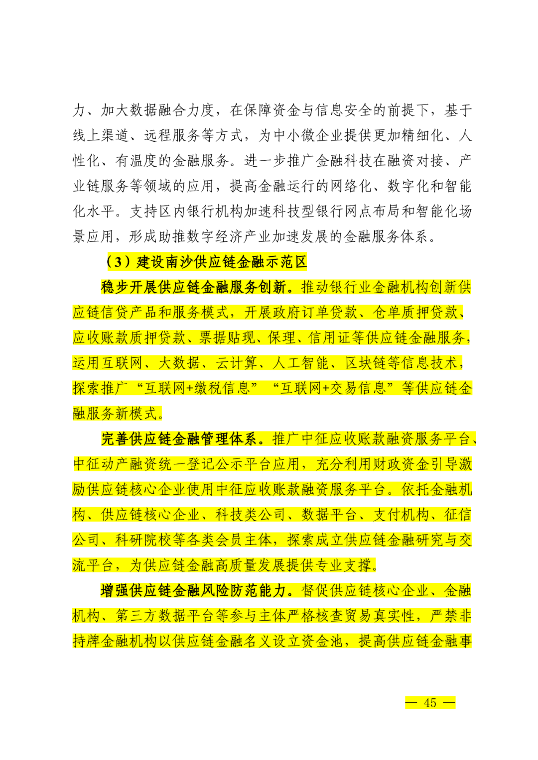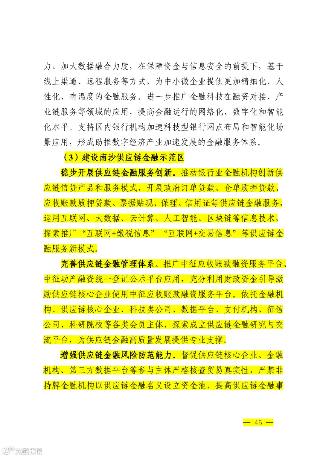 增强供应链金融风险防范能力。督促供应链核心企业、金融机构、第三方数据平台等参与主体严格核查贸易真实性,严禁非持牌金融机构以供应链金融名义设立资金池,提高供应链金融事中事后风险管理水平,加强对产业链供应链金融的规范和监管, 避免核心大型企业挤占中小企业利益。