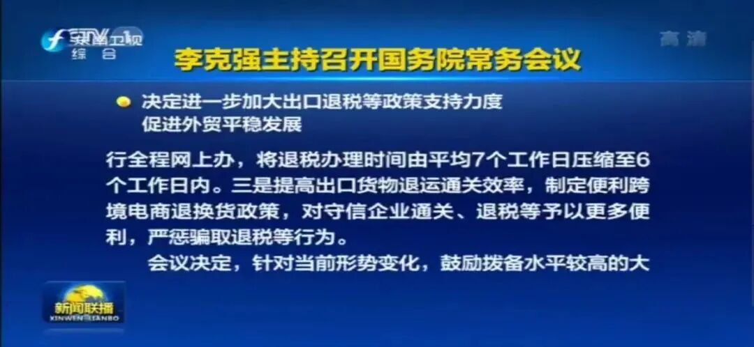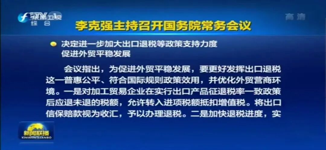会议指出,为促进外贸平稳发展,要更好发挥出口退税这一普惠公平、符合国际规则政策效用,并优化外贸营商环境。