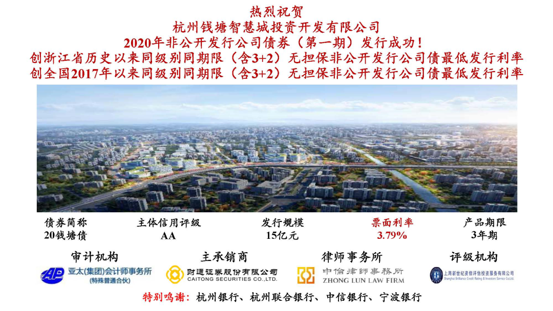 8月31日下午,江干区首单境内非公开发行公司债——杭州钱塘智慧城投资开发有限公司20钱塘债(债券代码:167578)成功发行。这是钱塘智慧城下属国有企业完成转型后,依托公司主体信用评级在公开市场的首次亮相。
