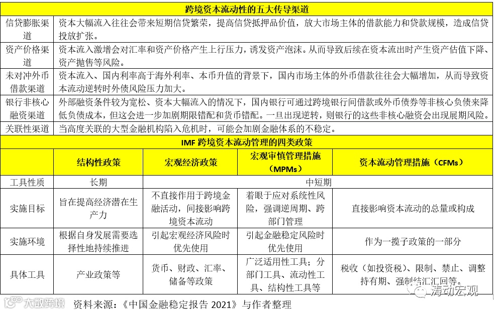 IMF等相关研究表明,跨境资本流动的风险传导可以分为信贷膨胀、资产价格、未对冲外币借款、银行非核心融资、关联性五类渠道,且这五类渠道之间会通过反馈效应相互强化。同时IMF通过《二十国集团基于国家经验得出的资本流动管理一致性结论》(2011年)和《资本流动开放与管理:机构观点》(2012年)等文件构建了针对跨境资本流动的政策框架。