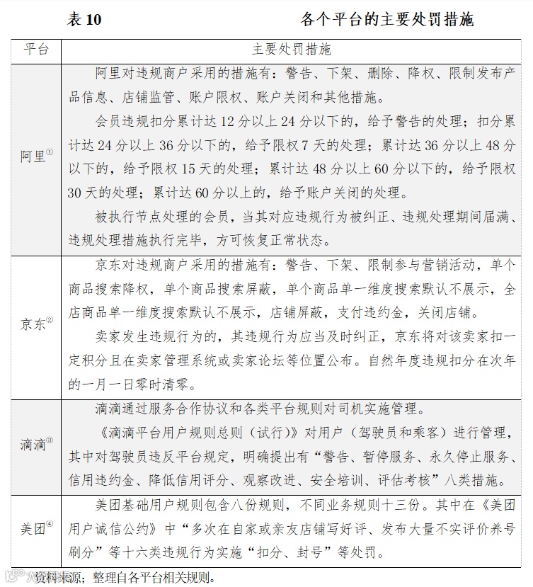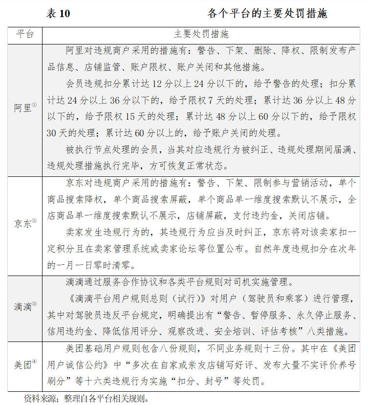平台的规则设置灵活多样,评罚结合,从扣分扣点到罚款,到评价体系和声誉机制;从搜索降权到搜索屏蔽,再至降低活跃度以至驱逐出平台,很灵活很实用。表10中是若干平台的主要处罚手段。