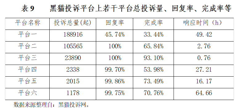 综合表8中典型平台的争议纠纷处理规则及其具体内容分析,平台交易纠纷处理总体流程涵盖“举证责任”“交易纠纷赔付”和“平台拥有判定权力”这三个方面。在举证责任方面,规定了不同类型纠纷中的交易各方负有举证责任和举证期限,例如平台有权要求“买家或商家提供证据证明,且有权单方判断证据的效力;买家主张未收到货的,商家应对其未收到商品的情形承担举证责任;”淘宝规定“对商品或服务产生争议的,买家应当在交易成功后的15天内提出维权主张”。京东规定“有权要求买家或商家提供证据证明,且有权单方判断证据的效力;卖家对于未收到货、签收商品不一致等买家需要承当举证责任”。在“交易纠纷赔付”方面,京东对于运费赔付实施“谁过错,谁承担”原则,对于先行赔付在双方协商未果的情况下,京东平台介入,并根据“纠纷规则”“双方提供的证据”进行处理,“交易纠纷规则没有明确规定的,由京东依其独立判断做出处理”。在平台判定权力方面,规定在双方纠纷处理中平台享有证据有效判定、结果判定等权力,例如“有权单方判定争议结果”、“有权根据卖家提供的图片证据直接判定”。总体看,各平台对于投诉给予了高度重视(见表9)。