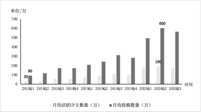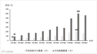 每个平台都是新内容迅速上线,新产品市场占比在迭代中处于高位。以视频网站哔哩哔哩(以下简称B站)为例,B站月均活跃主播(UP主)和月均投稿数量,2018年初为30万和90万,到2020年2季度,就分别增长到了190万和600万(图8)。如此数量的主播和上线内容,是任何线下娱乐形态所不可比拟的。