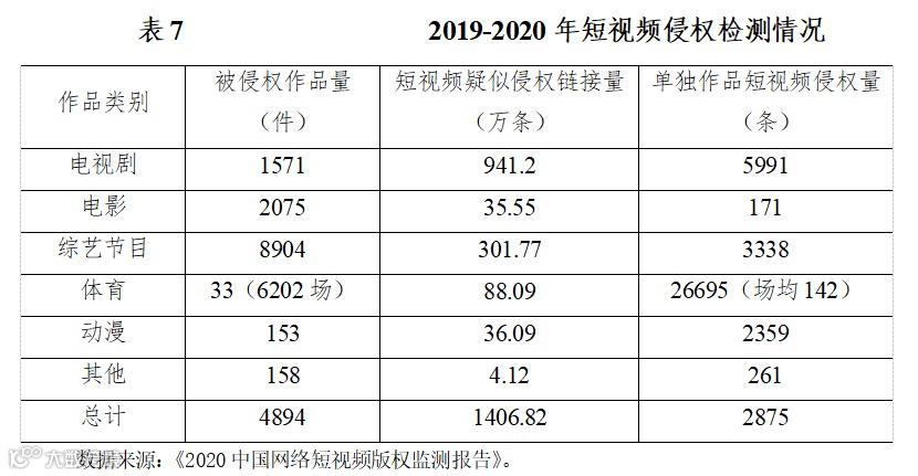 视频内容侵权也是平台突出问题。2019年至2020年10月,12426版权监测中心监测的电影、电视剧、综艺节目、体育赛事、动漫等类型4894件作品中,共监测到短视频疑似侵权链接1406.82万条,平均每项体育赛事的短视频侵权量达2.67万条;电视剧作品单部作品短视频侵权达到5991条(见表7)。这些侵权问题通过主流平台维权成功率超过95%。