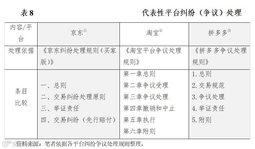 有交易就会有纠纷,平台交易数量巨大,因此相应纠纷和投诉数量很大。平台通过建立了纠纷解决规则和采取相应措施,为处理交易中的纠纷提供依据,进而规范交易流程(见表8)。