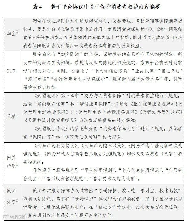 消费者是平台生存发展的基础,与线下消费者主要是购买者的身份相比,平台消费者具有购买者和信息提供者双重身份,地位更加重要。同时,平台上交易双方不见面,产品品质既不能事先查验,也不能在交易中“眼见为实”,商户稳定性差,如果没有平台严格监管,交易中各种欺诈行为将呈现较高概率。因此在多个平台的协议中,关于保护消费者权益的内容处于首要地位。下面是一些著名平台的协议中关于保护消费者权益的内容(表4)。